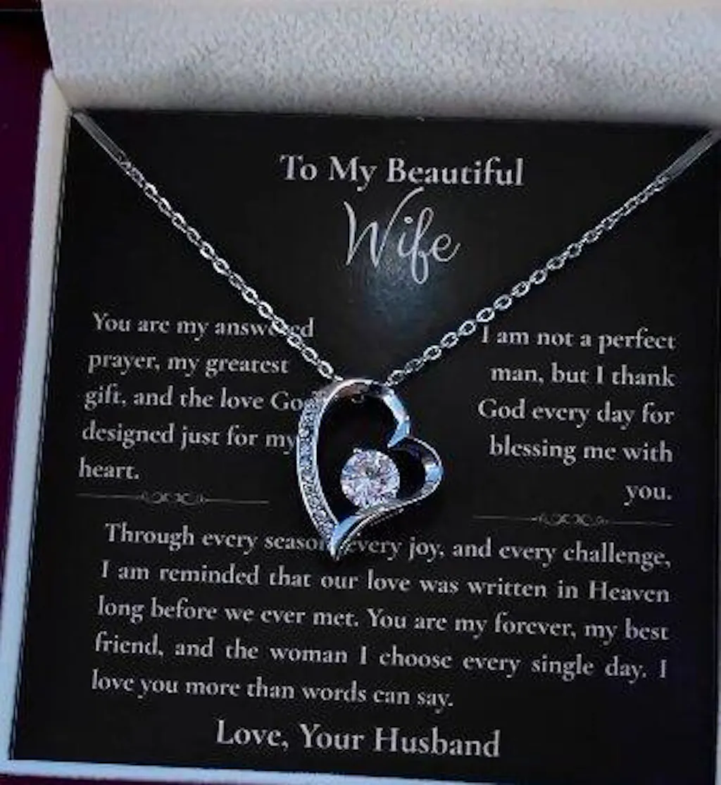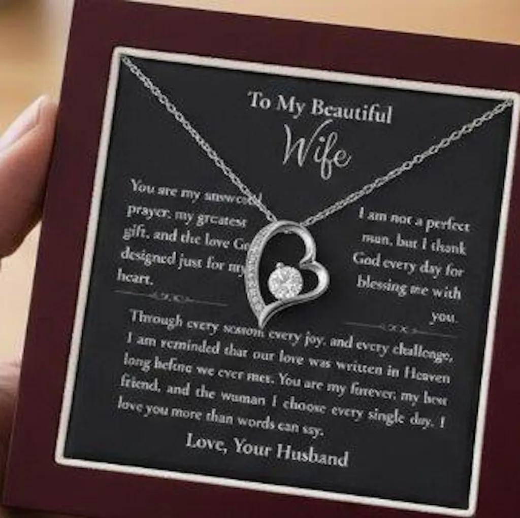 The Forever Love Necklace is more than jewelry — it’s a meaningful keepsake that comes with a heartfelt message card written from a husband to his wife. It’s designed to celebrate love, commitment, and the journey you share together.
