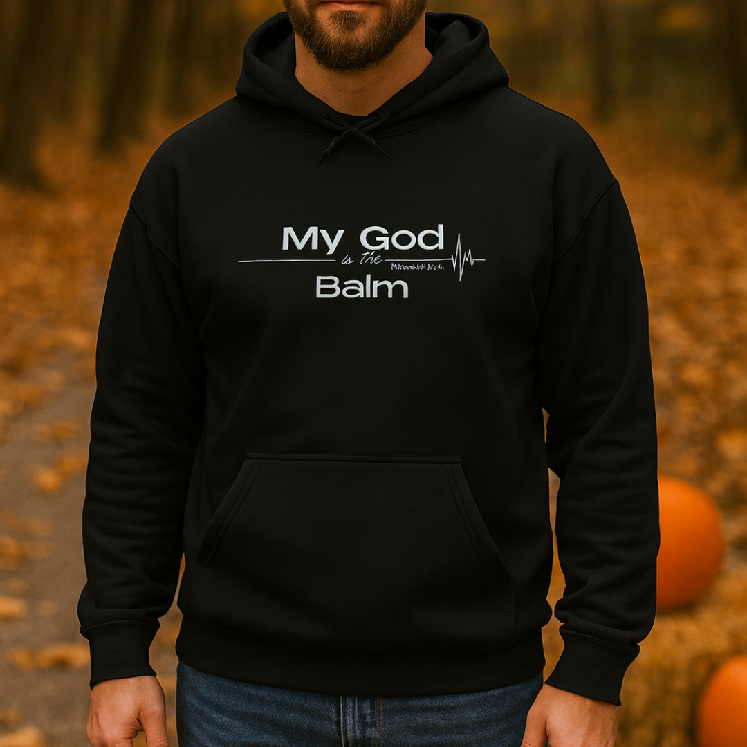 Faith-Based Inspirational Quote Hoodie – “My God is the Balm” | Unisex Christian Sweatshirt, Comfort Wear, Religious Gift
